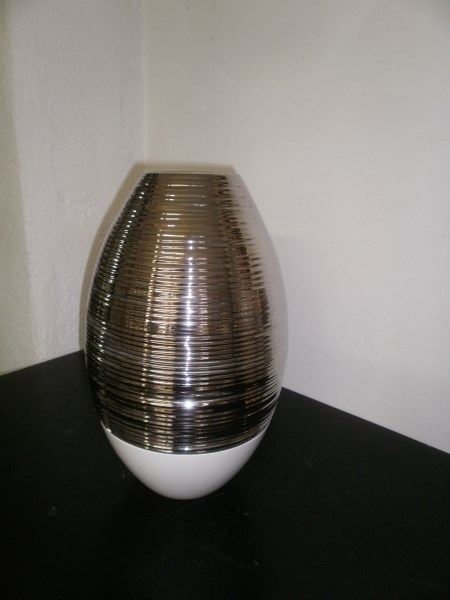 RIG0118B Vaso BOMBATO RIGATO bianco e platino h. cm. 46 Ø cm. 32